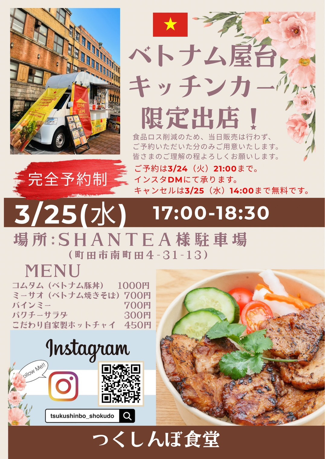 3月25日、つくしんぼ食堂のキッチンカーが、当店駐車場で、コムタムなど販売します。